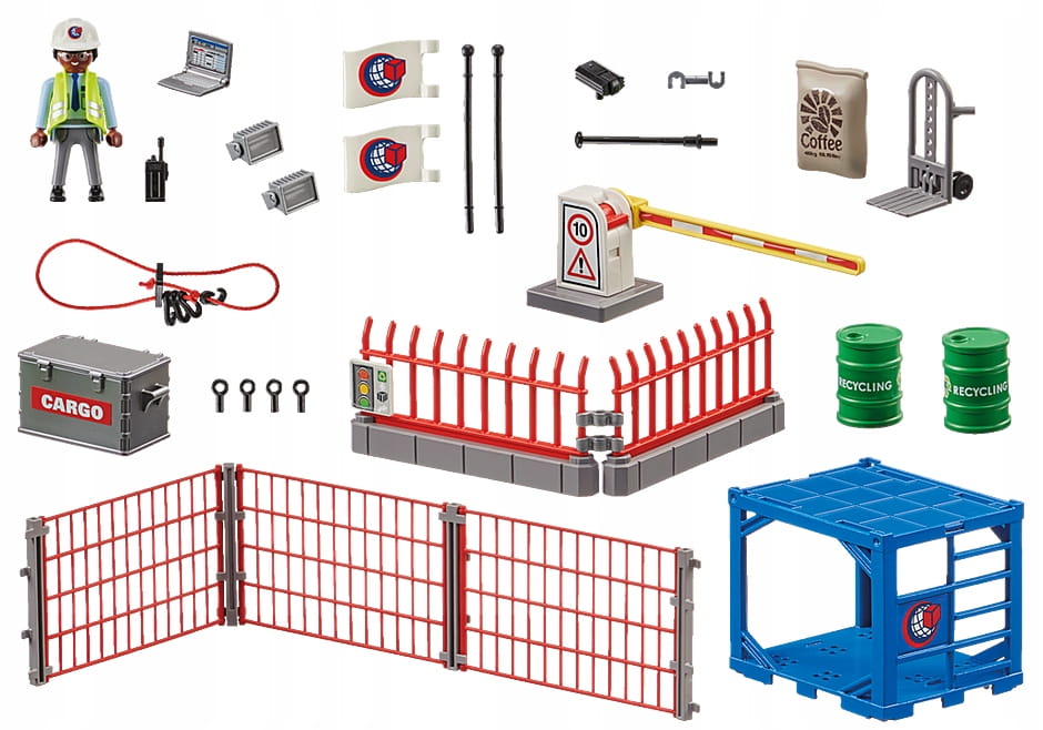 Zestaw zawiera 65 elementów, w tym figurkę robotnika portowego, w odblaskowej kamizelce oraz kasku.