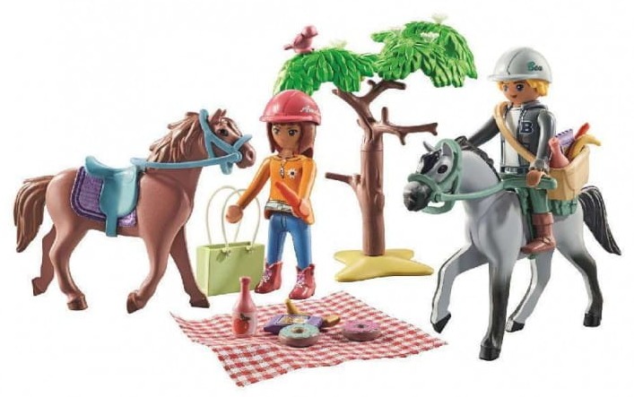 W zestawie znajdziesz dwie figurki - Bena i Amelię, dwa konie (brązowa klacz pełnej krwi angielskiej i siwy wałach andaluzyjski), drzewo, kosz piknikowy z wyposażeniem, koc i wiele innych tematycznych akcesoriów.