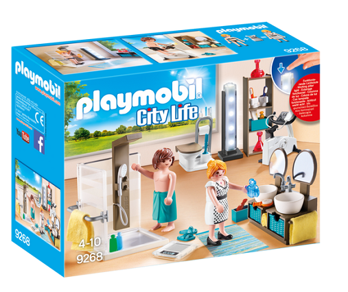 Zestaw PLAYMOBIL zawiera 2 figurki, prysznic, umywalkę, muszle klozetową, rowerek, wagę, wagę i inne elementy wyposażenia łazienki.