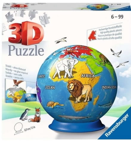 Z trójwymiarowymi puzzlami od firmy Ravensburger mali odkrywcy zbudują model globusa z ilustracjami zwierząt. Elementy układanki są ponumerowane z tyłu, a całość wykonana jest z trwałego tworzywa odpornego i łatwego w czyszczeniu.