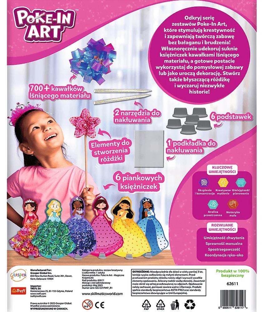 Poke-In Art pozwala dzieciom własnoręcznie ozdabiać suknie księżniczek, wbijając ponad 700 kawałków lśniącego materiału w piankowe kształty za pomocą specjalnego narzędzia do nakłuwania. To prosta, czysta i niezwykle satysfakcjonująca zabawa, która rozwija kreatywność i daje poczucie tworzenia prawdziwych dzieł sztuki.