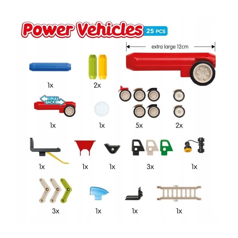 Z zestawem "Power Vehicles", składającym się z 25. części możesz zbudować różne pojazdy np. wóz strażacki, wózek widłowy, holownik, pick-upa, vana itp. Element z napędem typu "pull-back" doda dynamiki do organizowanych wyścigów i zabaw. Pociągnij pojazd do tyłu i puść, a pojedzie daleko przed siebie!