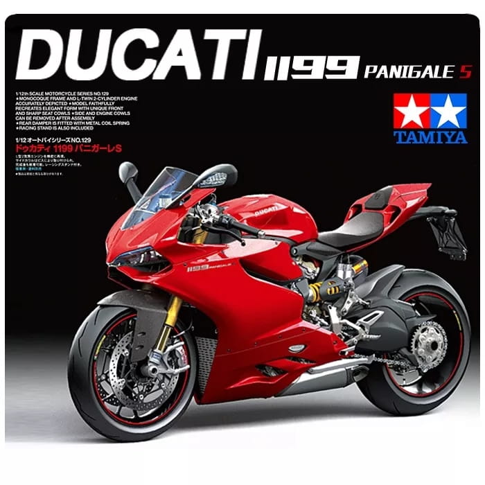 Tamiya rozszerzyła swoją serię motocykli w skali 1/12 o ten zupełnie nowy model Ducati 1199 Panigale S. Ducati 1199 Panigale, który był podstawą motocykla przedstawionego przez ten model, został ogłoszony na targach motoryzacyjnych w Mediolanie w 2011 roku. Jest to zapierające dech w piersiach połączenie pięknego wyglądu i najnowocześniejszych technologii, z nowo zaprojektowanym silnikiem, jednoczęściową ramą ze skrzynką powietrzną i nie tylko. Model 1199 Panigale S zawiera ulepszenia zawieszenia, kół, świateł i innych części, które poprawiają wrażenia z jazdy.