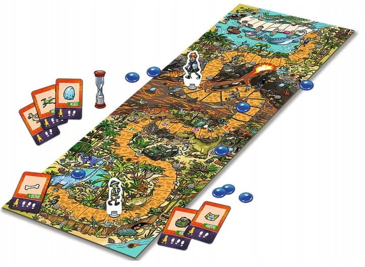 Gra zawiera długą, ponadmetrową planszę z dużymi rysunkami, przedstawiającymi świat dinozaurów. Większe karty i uproszczone ilustracje ułatwiają poszukiwania najmłodszym graczom.