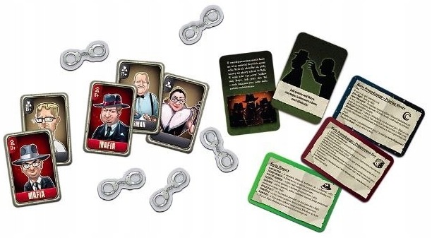 6 kart Mafii, 12 kart Obywateli, 18 kart Pomocy, 18 kart Motywów, 2 karty Prowadzącego, 18 żetonów Kajdanek, instrukcja.