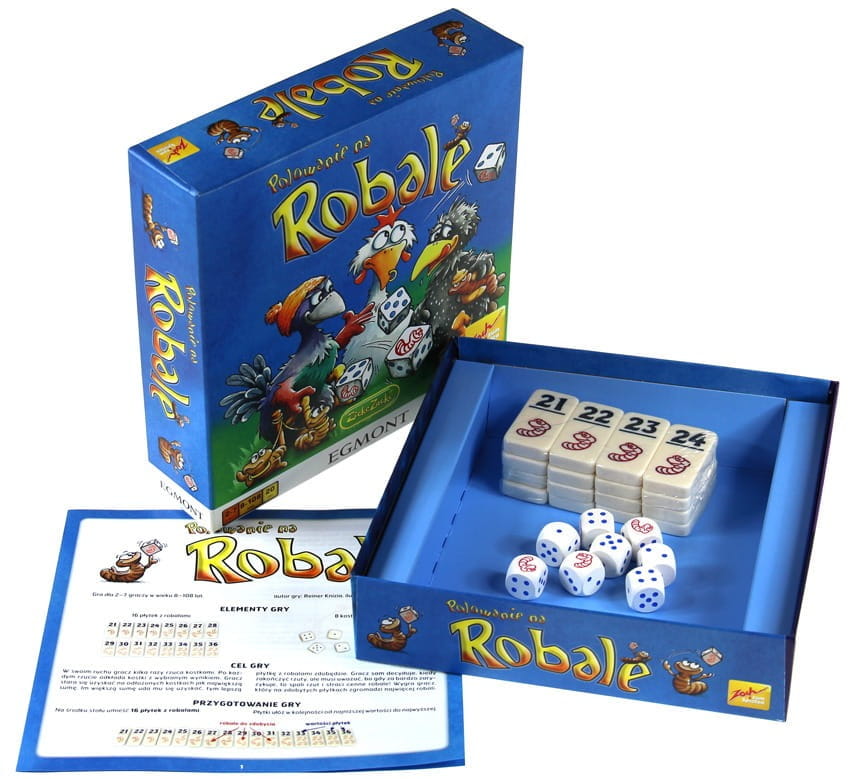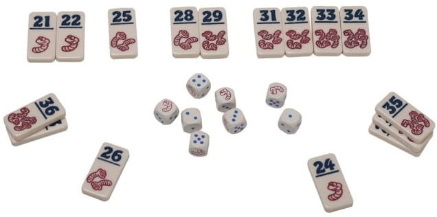 Teraz rzuć kostkami. Początkowo masz ich 8 do dyspozycji. Staraj się uzyskać jak największy wynik, uważając aby nie zdublować wybranej już wcześniej wartości kostki. W jednym ruchu możesz bowiem zachować tylko te kostki, na których jest jednakowy wynik. Same piątki, same trójki, same robale itd. Odkładasz je na bok, a pozostałymi rzucasz ponownie, do momentu aż nie zdecydujesz się policzyć łączną wartość odłożonych kostek i zabrać z rzędu płytkę z odpowiednią liczbą. Ale! Przepustką do zgarnięcia płytki jest wyrzucenie przynajmniej jednej kostki z obrazkiem robala!