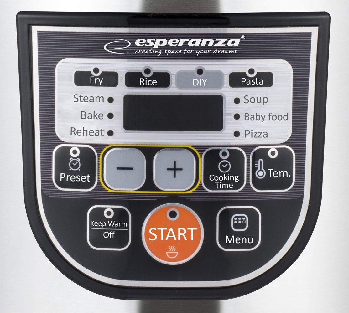 Nasz multicooker Esperanza jest nieocenionym pomocnikiem w kuchni i dostarcza wielu korzyści. Posiada różne funkcje przygotowywania potraw, np.: smażenie, robienie frytek, gotowanie na parze czy pieczenie ciast i chleba. Oszczędza energie, zajmuje niewiele miejsca i znacznie skraca czas spędzony przy gotowaniu. Dzięki prostemu i intuicyjnemu wyświetlaczowi LCD można łatwo skonfigurować funkcje gotowania i dostosować ich czas do swoich potrzeb. Z naszym multicookerem przygotujesz wszystkie swoje ulubione potrawy szybciej i zdrowiej! Smacznego!