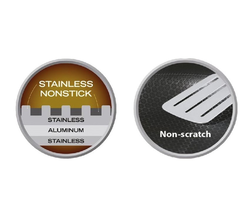 Patelnia posiada trójwarstwowy korpus, co pozwala na równomierne rozprowadzanie temperatury. Warstwa zewnętrzna wykonana jest ze stali nierdzewnej 430, która posiada magnetyczne właściwości i jest odpowiednia do stosowania na wszystkich źródłach ciepła. Warstwa rdzeniowa natomiast wykonana jest z czystego aluminium, co pozwala na jeszcze lepsze przewodzenie ciepła od podstawy do krawędzi patelni. Ostatnia warstwa wewnętrzna wykonana jest ze stali nierdzewnej 304, która jest bezpieczna do kontaktu z żywnością.