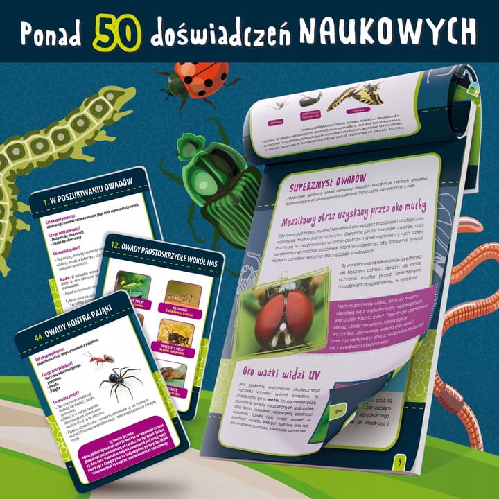 Zestaw naukowy do wykonania samodzielnych obserwacji, doświadczeń i zadań pozwoli dzieciom (i dorosłym!) poznać ciekawostki na temat owadów. Dzięki dołączonym kartom z ilustracjami i informacjami poznasz klasyfikację owadów, niezwykłe zdolności i zobaczysz piękne zdjęcia makro np. oczu muchy.